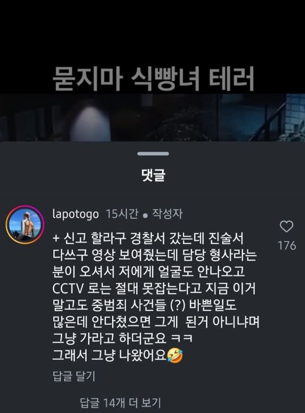 이어 A씨는 댓글을 통해 이후의 상황도 설명했습니다. A씨는 "신고하려고 경찰서 가서 진술서 다 쓰고 영상 보여줬다"면서 "그런데 담당 형사 분이 오셔서 제게 ‘얼굴도 안 나오고 CCTV로는 절대 못 잡는다’면서 ‘이거 말고도 중범죄 사건들 많은데 안 다쳤으면 된 거 아니냐. 그냥 가라’고 하더라"라고 적었습니다.