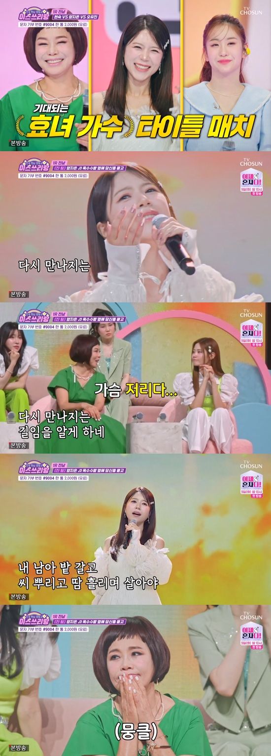 4일 방송된 TV조선 '미스쓰리랑'에서는 현숙, 양지은, 오유진이 효녀 가수 대전을 펼쳤다.