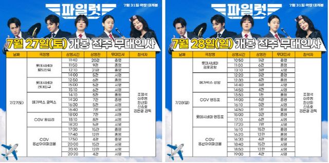 개봉 전 무대인사는 7월 27일(토)에 롯데시네마 월드타워를 시작으로 롯데시네마 건대입구, 메가박스 코엑스, CGV 왕십리, CGV 용산아이파크몰을 방문하며 7월 28일(일)에는 롯데시네마 김포공항, 메가박스 상암, CGV 영등포, 롯데시네마 영등포, CGV 용산아이파크몰에서 관객들을 만날 예정이다. 올여름 극장가에 편견 없이 유쾌한 웃음을 책임질 ‘파일럿’의 무대인사 예매는 순차적으로 오픈 예정이다.