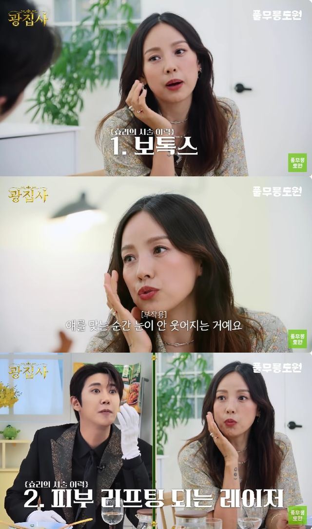 과거 '쟁반노래방'을 진행하던 20대 후반과 30대 초반 시절, 눈가 주름을 완화하기 위한 보톡스를 맞았다고 고백한 이효리는 "주름을 없애보려고 맞은 것인데 웃을 때 얼굴이 너무 무섭더라"고 떠올렸다.