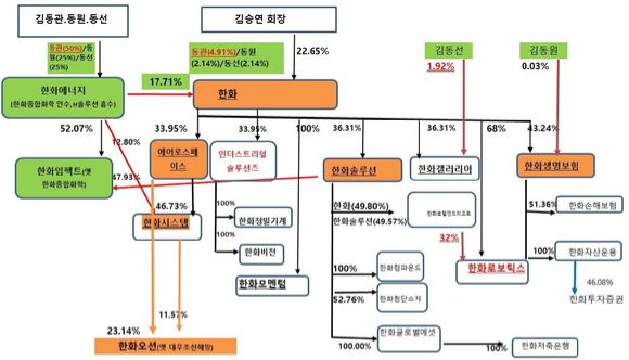 한화에너지가 오는 24일까지 한화 보통주 600만주(8.00%)를 취득하면 한화에너지의 한화 의결권 지분율은 공개매수 전 9.70%에서 17.71%로 늘어난다. 김승연 회장(지분율 22.65%)보다 지분율이 낮은 2대 주주지만, 김동관·동원·동선 지분을 더하면 26.9%로 최대주주나 다름없다. 김동관·동원·동선이 한화에너지 지분을 각각 50%, 25%, 25%를 보유한 최대주주라는 점을 감안하면 '김동관·동원·동선→한화에너지→한화'의 지배체제가 만들어지는 셈이다.