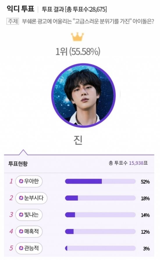(엑스포츠뉴스 이정범 기자) 진이 고급스러운 분위기를 가진 아이돌 투표 1위에 올랐다.