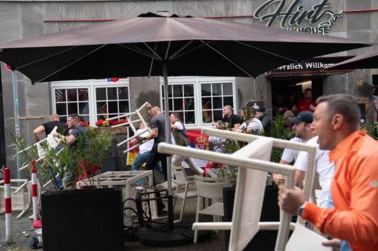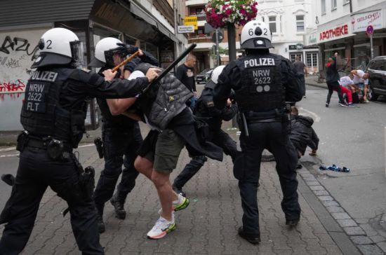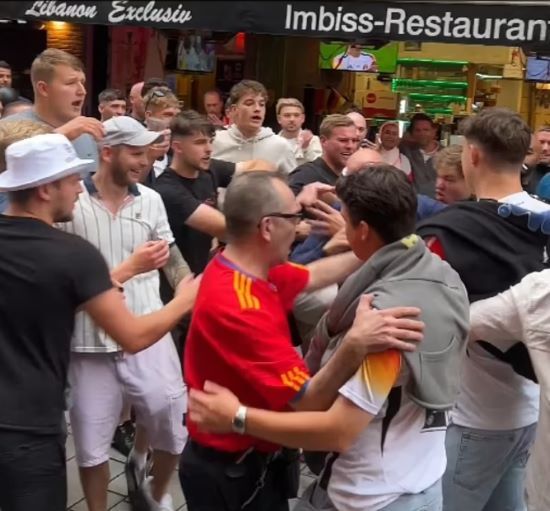 (엑스포츠뉴스 김준형 기자) 잉글랜드 팬들이 경기장 밖에서 2024 유럽축구연맹(UEFA) 유럽축구선수권대회(유로 2024) 8강에서 탈락한 독일 팬들을 조롱해 싸움이 일어났다. 경찰의 제지 끝에 겨우 사건은 일단락됐다.