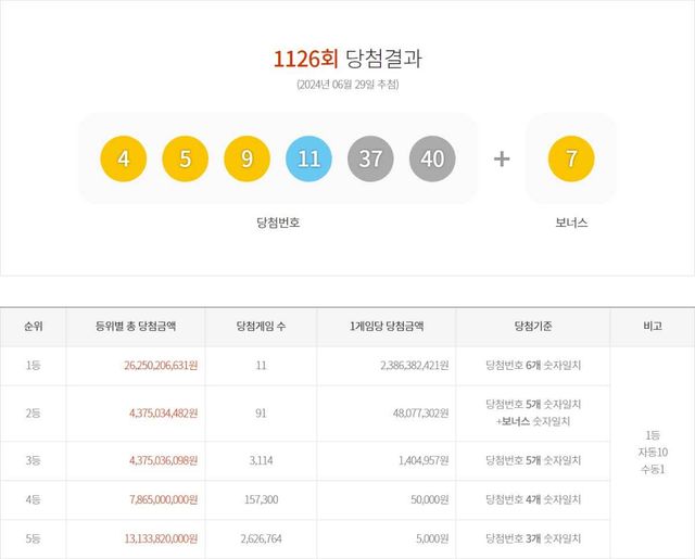 6월 29일 추첨이 된 1125회 당첨번호는 '4, 5, 9, 11, 37, 40' 보너스 번호는 '7' 번이다.
