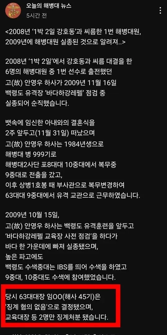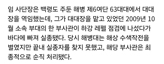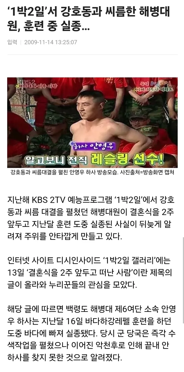 6여단 63대대에선 1박2일 강호동과 씨름했던 하사가 바다에 빠져 실종됨.