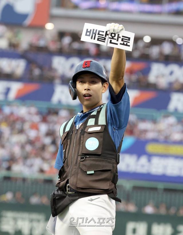 하지만 이는 몸풀기에 불과했다. 본 경기에선 더 화끈했다. 3회 첫 타석에 나선 황성빈은 배달원 헬맷과 조끼, 오토바이까지 준비해 팬들의 시선을 끌었다. 안타를 '배달'하는 의미의 코스프레. 오토바이를 직접 몰고 타석에 들어선 황성빈은 타석에서 1루수 왼쪽으로 흘러가는 내야 안타를 때려내며 출루에 성공했다. 이후 황성빈은 '배달완료'라고 써있는 쪽지를 팬들에게 선보이며 환호를 이끌었다.