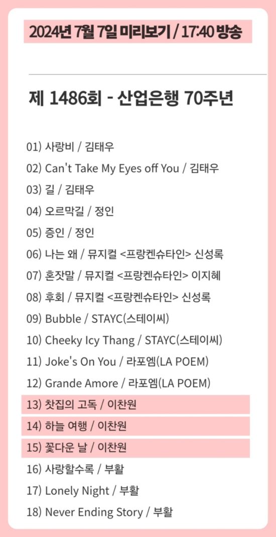 사전 공개된 프로그램에 따르면, 이찬원은 나훈아 원곡의 '찻집의 고독', '뮤직뱅크 1위 곡'인 '하늘 여행', 그리고 방송 최초로 '꽃다운 날' 무대를 선보인다.