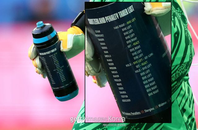 경기 후 픽퍼드의 승부차기 선방 비결이 공개됐다. 그가 가지고 있는 물병에 스위스 대표팀 선수들의 키커 별로 취해야 할 액션들을 미리 적어둔 것이다. 아칸지의 경우 ‘왼쪽으로 다이빙’으로 적혀 있었다. 실제 픽퍼드는 물병에 적힌 대로 왼쪽으로 다이빙해 아칸지의 킥을 선방했다.