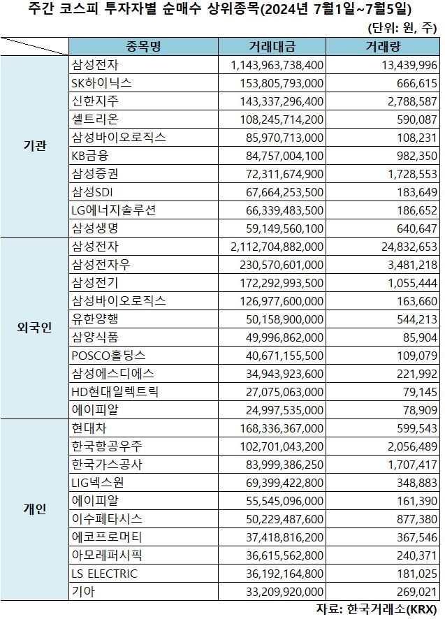 기관 '삼성전자'·외인 '삼성전자'·개인 '현대차' 1위 [주간 코스피 순매수- 7월1일~7월5일]