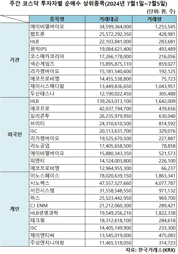 기관 '에이비엘바이오'·외인 'HLB'·개인 '이노스페이스' 1위 [주간 코스닥 순매수- 7월1일~7월5일]