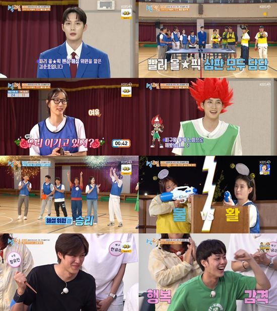 '1박 2일' 멤버들과 해설위원들은 처음에 앉았던 의자에 따라 '파란 팀'과 '노란 팀'으로 나뉘어 게임을 펼쳤다. 파란 팀은 첫 번째 대결 '짐볼 타고 풍선 팡', 두 번째 대결 '쪼그려 앉아 단체 줄넘기'에서 연승을 거두며 총 4명의 노란 팀 인원을 데려오는 데 성공했다. 마지막 대결 '두더지 사격'에서는 노란 팀 정유인과 파란 팀 기보배의 숨 막히는 1:1 대결이 전개된 가운데, 정유인이 승리를 거두면서 파란 팀에서 인원을 충원할 수 있게 됐다.
