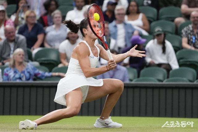 에마 나바로(17위·미국)가 7일(현지시각) 영국 런던의 올잉글랜드 클럽에서 열린 윔블던 테니스대회 여자 단식 16강전에서 코코 고프(2위·미국)와 경기하고 있다. 나바로가 2-0(6-4 6-3)으로 완승하고 8강에 올랐다. 런던(영국) ㅣ AP 뉴시스