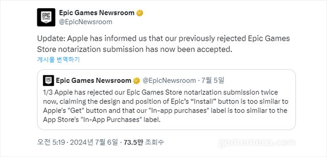 ▲ 애플이 에픽게임즈 스토어를 승인했다고 공지한 에픽게임즈 (자료출처: 에픽게임즈 뉴스룸 공식 X)