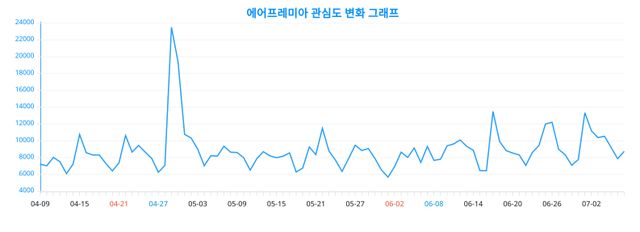 에어프레미아에 관한 트렌드지수 그래프가 최근 업데이트 되었으며, 현재 8,747 포인트를 기록, 전일 7,873 포인트 대비 상승하였다.