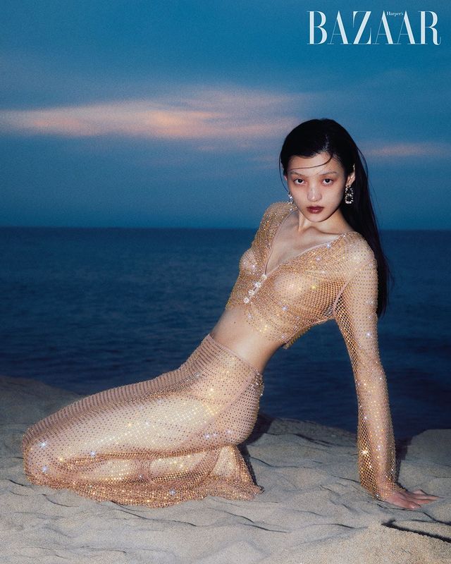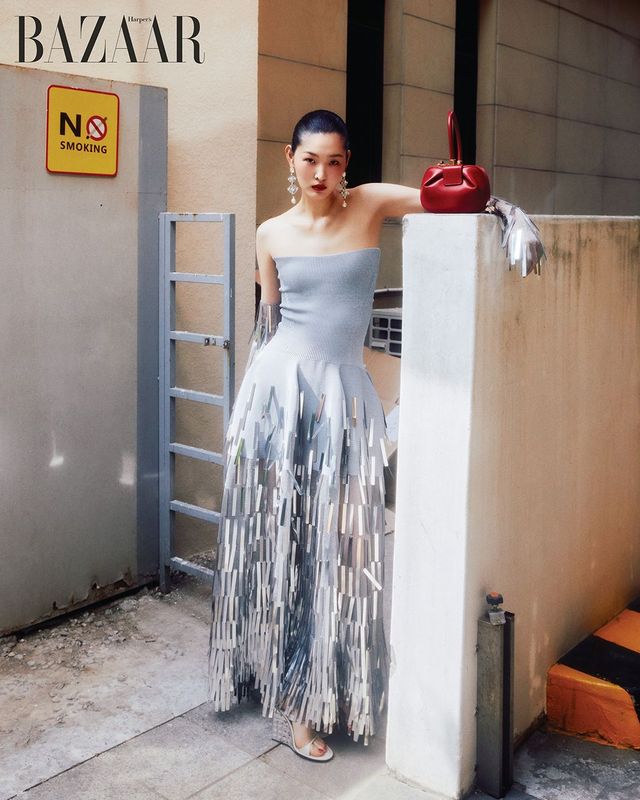 시퀸 드레스, 장갑은 Cfcl by 10 Corso Como Seoul. 드롭 귀고리는 2백10만원대 Roger Vivier. 톱 핸들 백은 3백만원대 Gabriela Hearst. 스터드 장식의 웨지 샌들은 Acne Studios.