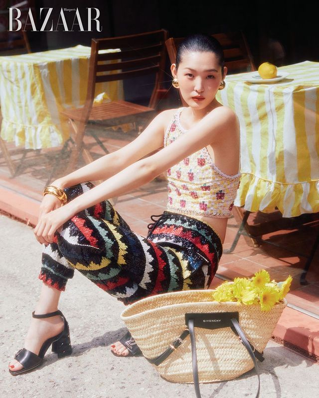 엠브로이디드 실크 튤 소재의 탱크톱, 스팽글 장식의 트위드 팬츠는 Chanel. 귀고리는 Saint Laurent by Anthony Vaccarello. 뱅글은 1백만원대 Fendi. 샌들 힐은 Louis Vuitton. 라피아 바스켓 백은 Givenchy Plage.