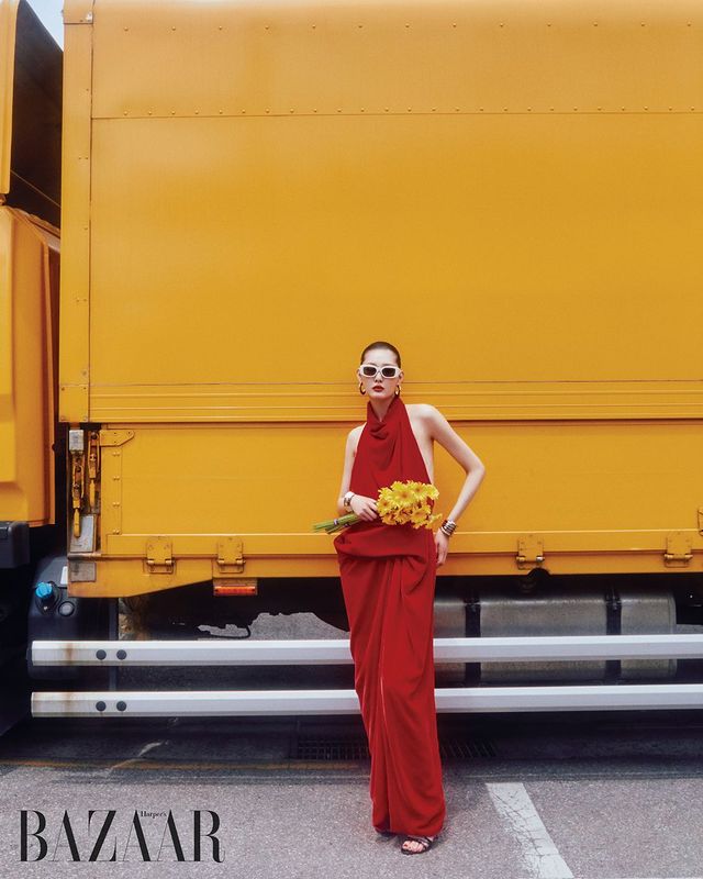 홀터넥 드레스는 8백20만원대 Alexander McQueen. 선글라스는 Celine by Hedi Slimane. 후프 귀고리는 1백만원대 Fendi. 뱅글은 모두 Saint Laurent by Anthony Vaccarello. 스트랩 힐은 Tom Ford.
