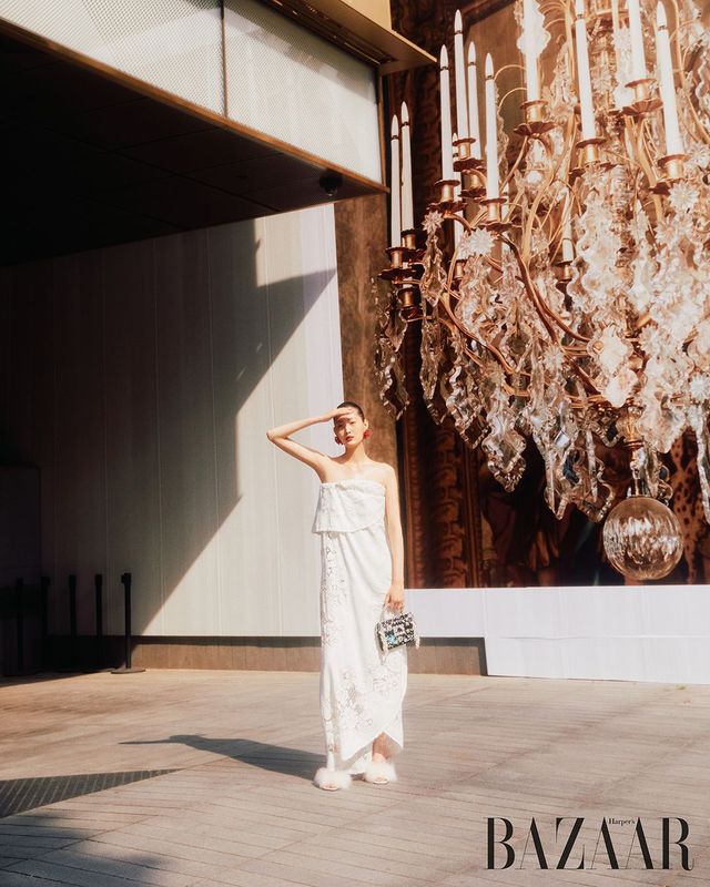 테이블 클로스 드레스는 Balenciaga. 귀고리는 2만원대 H&M. 주얼 장식 백은 1천3백만원대 Roger Vivier. 퍼 장식 샌들 힐은 Maison Margiela.