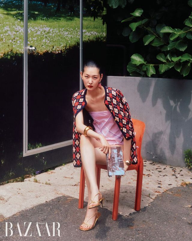 아가일 패턴의 카디건, 스카프 톱, 브리프, 스트랩 힐은 모두 Prada. 키치한 디자인의 귀고리는 Coach. 오른팔에 착용한 뱅글은 Fendi. 왼팔에 착용한 뱅글은 1백만원대 Saint Laurent by Anthony Vaccarello.