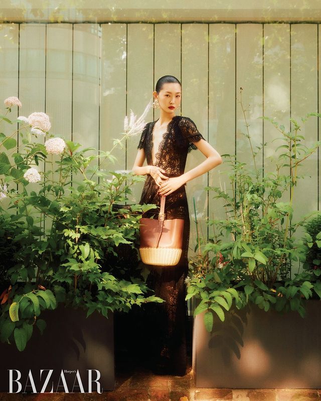 레이스 드레스는 Celine by Hedi Slimane. 귀고리는 Chanel. 버킷 백은 7백30만원대 Loro Piana. 슬라이드는 1백만원대 Fendi.