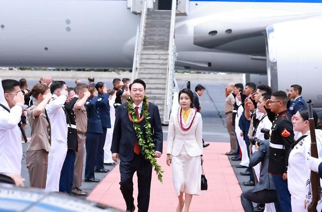 当地时间8日,韩国总统尹锡悦和夫人金建希抵达美国夏威夷珍珠港·希卡姆空军基地,正式开启访美行程。