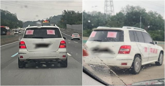 작성자는 글과 함께 당시 촬영한 사진을 여러 장 게시했다. 사진 속에는 흰색 벤츠 뒷유리에 욱일기 2장이 붙은 모습이 담겨 있다. 그뿐만 아니라 조수석 쪽에도 욱일기 4장이 나란히 붙은 모습이 보였다.