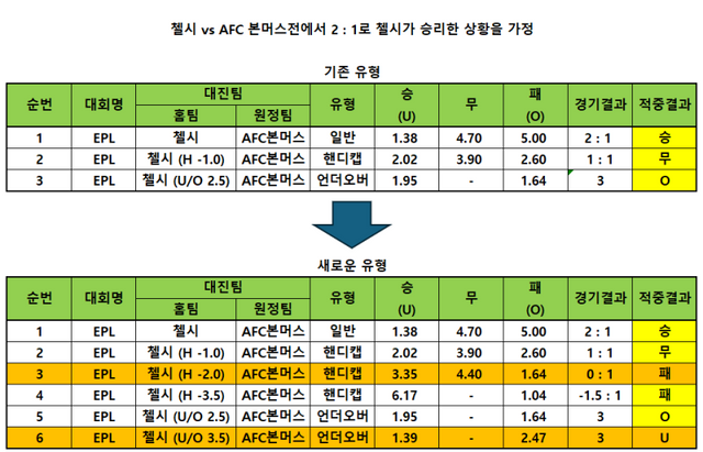 예를 들어, 첼시(홈)-본머스(원정)전에서 첼시가 2:1로 승리했다고 가정했을 때, 기존 프로토승부식에서는 첼시(핸디캡/-1.0) 유형만 선택할 수 있었다. 이에 따라 ‘무’ 결과 밖에 얻을 수 없었지만, 새로운 유형에서는 선택지가 많아졌다. 이 경우, 기존과 다른 첼시(핸디캡/-2.0) 유형을 선택했다면, 결과는 ‘패’에 해당된다.