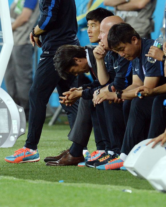 지난 2014년 6월 27일 오전(한국시간) 브라질 상파울루의 아레나 지 상파울루 스타디움에서 열린 2014브라질월드컵 한국 축구국가대표팀과 벨기에 축구국가대표팀의 H조 3차전 경기에서 한국 홍명보 감독이 경기 후반 패색이 짙어지자 고개를 숙이고 아쉬워 하고 있다. [사진=뉴시스]