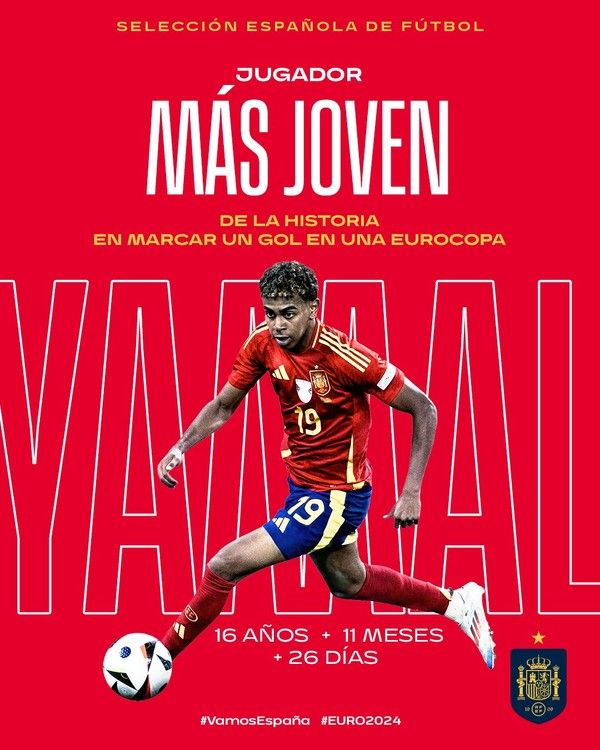 그러나 스페인이 동점골을 뽑아냈다. 야말이 드디어 유로 최연소 득점 기록을 썼다. 전반 21분 야말이 오른쪽 페널티박스 바깥에서 큰 움직임 없이 프랑스 수비를 묶어놨고, 기습적으로 각도를 연 뒤 시도한 왼발 감아차기 슈팅이 왼쪽 골대를 맞고 골문 안으로 빨려들어갔다.