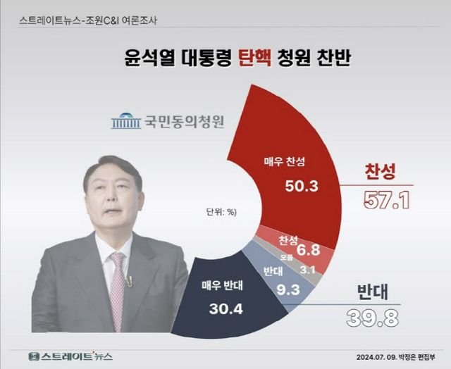 윤 대통령 탄핵 청원에 응답자 57.1%는 ‘매우 찬성한다’(50.3%)거나 ‘대체로 찬성하는 편’(6.8%)이라고 답했다. 탄핵 청원에 반대한다는 응답자 비율은 39.8%였다. 국회 법제사법위원회는 야당 주도로 이달 19일과 26일 윤 대통령 탄핵 청원을 심사할 청문회를 열기로 했다. 야당은 대통령 부인 김건희 여사와 그 어머니 최은순 씨를 청문회 증인으로 채택했다.