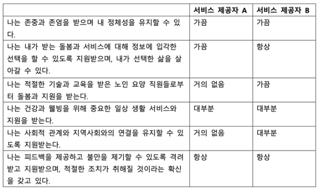 이 결과를 어떻게 해석할 수 있을까? 우선 아직 이용경험이 없는 대중에서 '기술과 교육'이 높은 중요도를 보였다는 것은 적합한 자격을 갖추지 못한 서비스와 서비스 제공자는 노인 요양서비스 시작의 걸림돌이 될 수 있음을 시사한다. 그리고 실제 요양서비스를 경험하고 있는 당사자일수록 '존중과 존엄'에 높은 가치를 부여했다는 사실은 요양 과정에서 서비스 제공자와 당사자 간의 상호작용이 존중과 존엄의 토대에서 이뤄지도록 만드는 일의 중요성을 새삼 보여주고 있다.