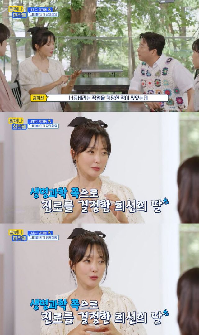 김희선은 “대치동을 하루에 16번까지 가봤다”고 털어놨다. 이어 “하나밖에 없는 딸이 배우되고 싶다고 하면 밀어줄 것이냐”는 질문에 “유튜버 직업을 희망한 적이 있는데 그 이후는 확고하게 정했다. 생명과학 쪽으로 굳혔다”고 설명했다.