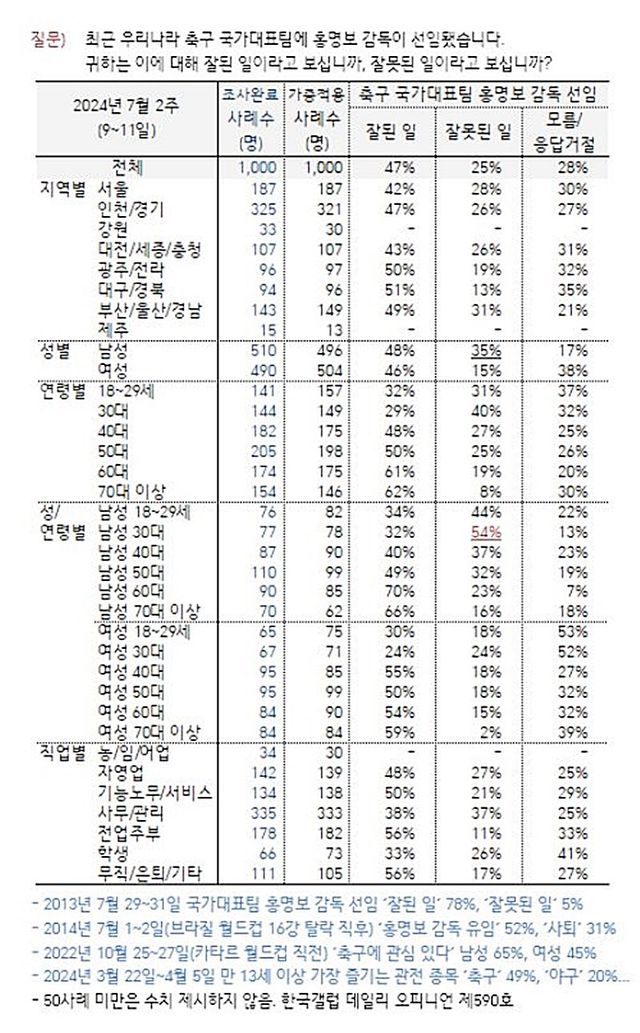 다음은 홍명보 감독 선임에 관한 한국갤럽 여론조사 결과다.