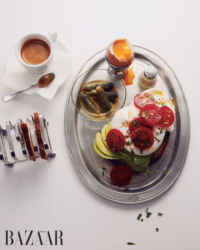 3 구운 사워도 위에 얇게 썬 아보카도와 부라타치즈, 버무린 토마토를 얹고 다진 파슬리로 마무리.
