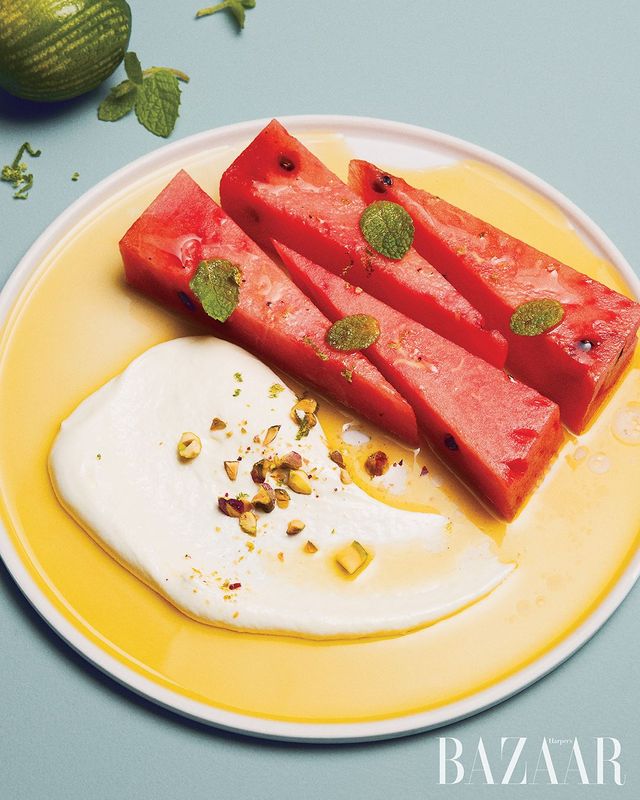 5 플레이트에 완성된 페타크림치즈와 수박을 보기 좋게 담고, 굵게 다진 피스타치오와 애플민트를 뿌린다.