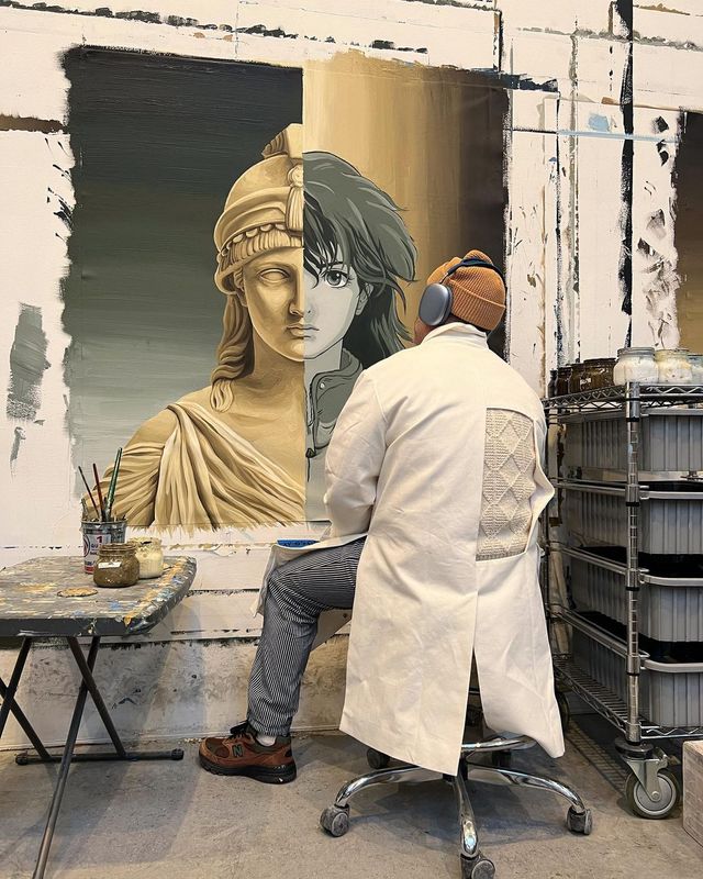 이번 전시 포스터에 담긴 아이코닉한 작품, 〈분절된 아이돌〉 시리즈에도 주목해 주세요. 고전 조각상과 애니메이션 캐릭터, 고대와 현대의 문화 아이콘을 병치해 대중들을 매료합니다. 현시점 가장 선망 받는 직업 중 하나인 ‘아이돌’을 제목으로 선정한 부분에서 위트가 느껴지네요.