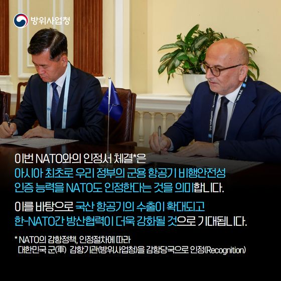 방위사업청은 미국 워싱턴 D.C에서 지난 9일(현지시각) 북대서양조약기구(NATO)와 우리 군 감항기관인 방위사업청의 비행안전성 인증 능력을 인정하는 감항인증 인정서를 체결했다고 12일 밝혔다.