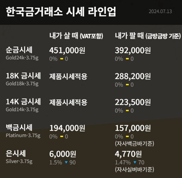 순금(24K) : 매입가 45만 1000원 / 매도가 39만 2000원