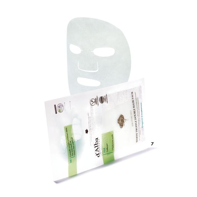 7 진정 농축액이 담긴 파우치를 터트려 섞어 사용하는 마스크 팩. 시트를 떼어낸 후에도 보습감이 오래 유지돼 피부가 자극받았을 때는 물론, 건조할 때 사용해도 좋다. 화이트 트러플 더블 마스크 팩, 4매입, 4만원, d’Alba.
