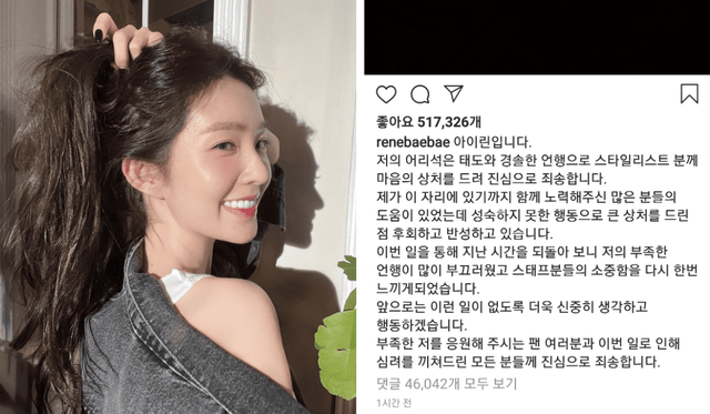 2020년 10월 22일 오후 9시경 아이린은 자신의 SNS에 사과문을 올렸는데, 그는 "저의 어리석은 태도와 경솔한 언행으로 스타일리스트 분께 마음의 상처를 드려 진심으로 죄송합니다."라고 입을 열었습니다.