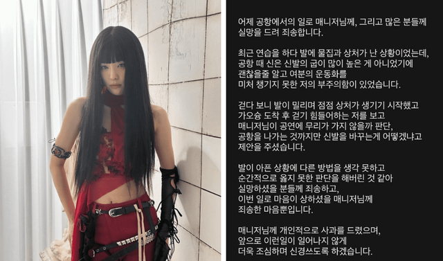 그는 "최근 연습을 하다 발에 물집과 상처가 난 상황이었는데, 공항 때 신은 신발의 굽이 많이 높은 게 아니었기에 괜찮을줄 알고 여분의 운동화를 미처 챙기지 못한 저의 부주의함이 있었다"고 입을 열었습니다.