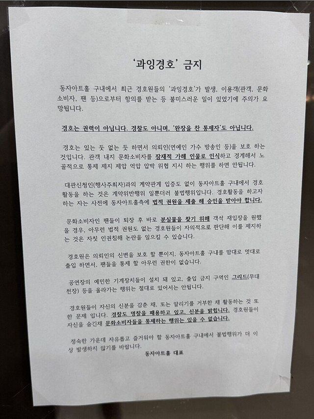 동자아트홀 구내에서 최근 경호원들의 '과잉경호가 발생, 이용객(관객, 문화 소비자, 팬 등)으로부터 항의를 받는 등 불미스러운 일이 있었기에 주의가 요망됩니다.