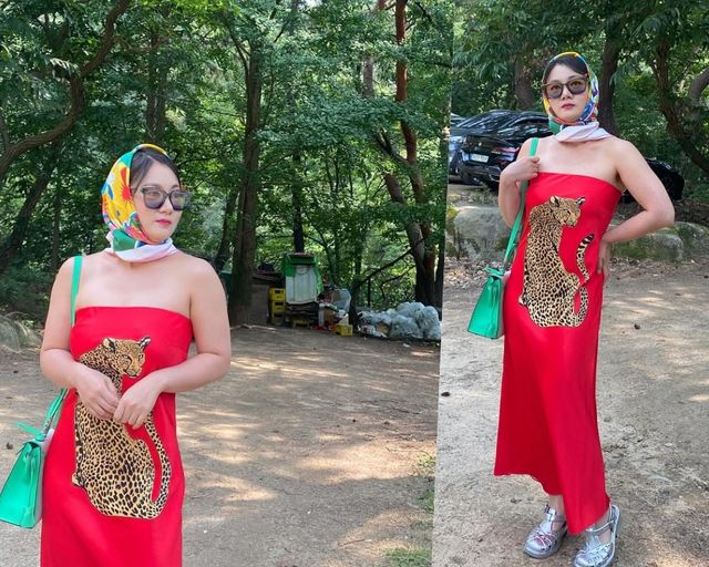 사진 속에는 지난 6월 방송된 MBC '나혼자 산다'에서 박나래가 성수동에서 쇼핑한 강렬한 레드 원피스를 입은 모습이 담겨있다. 머리에 두른 스카프와 초록색 백까지 보는 이들의 놀라움을 더한다.