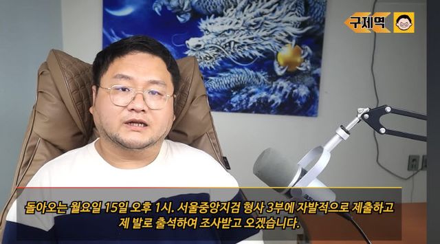 쯔양을 협박한 의혹을 받고 있는 구제역은 전날 본인 유튜브 채널 영상을 통해 “쯔양님에게 평온한 일상생활을 돌려줄 유일한 방법은 제가 하루빨리 검찰 조사를 받아 해당 사건에 대한 판단을 받는 것이라 생각한다”며 “황금폰이라고 불리는 제 1년간의 음성 녹취가 전부 포함된 핸드폰을 15일 오후 1시 서울중앙지검 형사3부에 자발적으로 제출하고 제 발로 출석해 조사를 받고 오겠다”고 밝혔다.