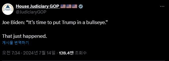 하원 사법위원회 공화당 의원단은 13일(현지시간) 엑스에서 “이제 트럼프를 겨냥할 때”(It‘s time to put Trump in a bullseye)라는 바이든 대통령의 발언을 올리곤, “그게 방금 일어난 일이에요”라고 밝혔다.