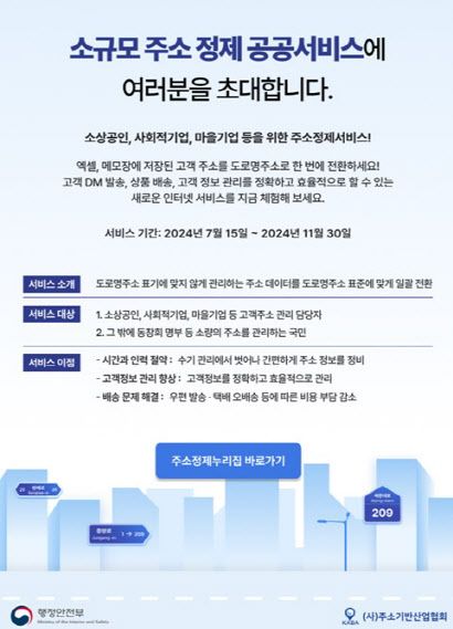 이에 행정안전부는 주소정제 공공 서비스를 무료로 제공해 소상공인의 불편을 해소하고, 표준 주소 사용을 널리 알릴 계획이다.