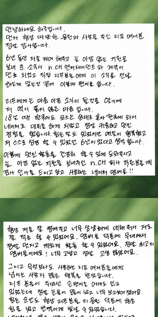소속사와 계약이 만료된 만큼 직접 소식을 전하는 게 맞다고 생각해 편지를 썼다는 하루는 전 소속사와 네이처 멤버들에게 감사 인사를 전했다.