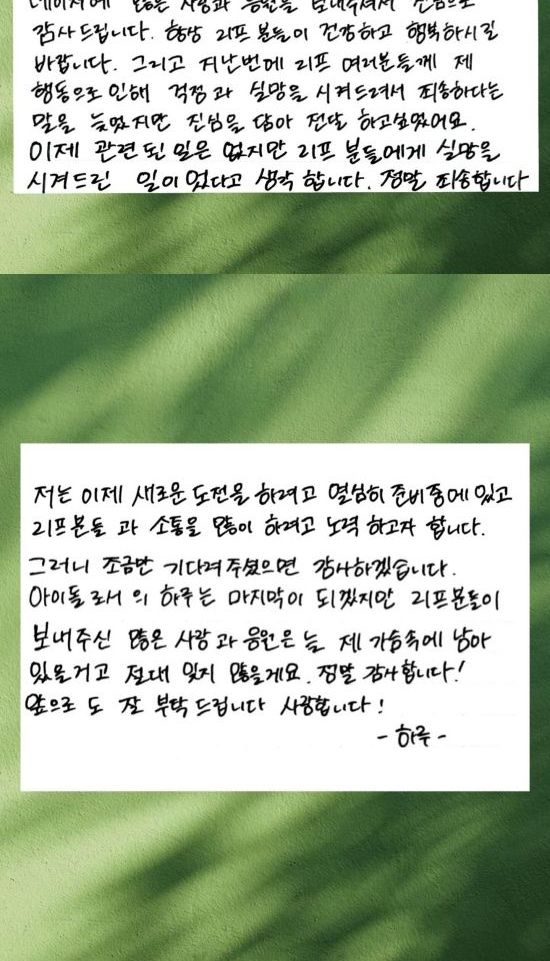 하루는 14일 오후 "리프 여러분에게"라는 글과 함께 사진을 게재했다. 공개된 사진에는 그가 적은 자필 메시지가 담겨 있었다.