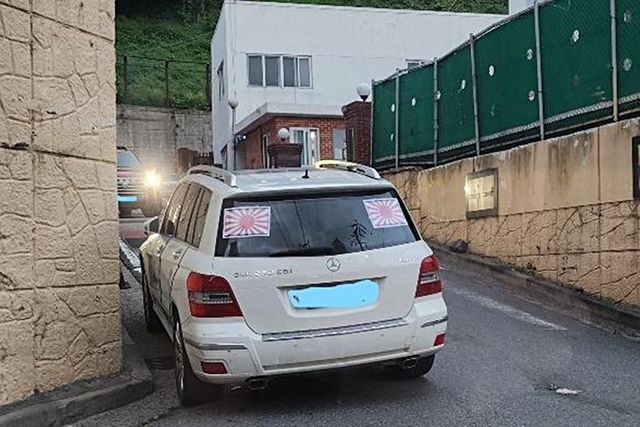 본인을 탁송 기사라고 밝힌 B씨는 “지난 3일 12시에 수원서 경부고속도로를 타고 부산으로 향하고 있는데 눈앞에 믿을 수 없는 광경이 펼쳐졌다”며 “차 뒷유리에 욱일기를 두 개나 붙이고 고속도로를 달리는 벤츠를 보고 내가 더위를 먹었나 싶었는데, 그 차량 앞을 보니 조수석 앞 유리에도 욱일기가 있었다”고 설명했다.