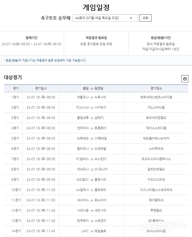 축구토토 승무패 44회차 대상경기